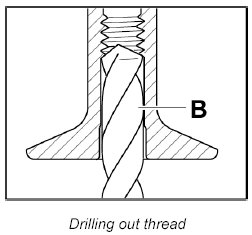 Drill out old thread as far as the base of the thread using a drill bit contained in the M10 kit B.