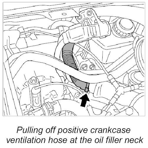 2. Pull off positive crankcase ventilation hose at the oil filler neck.