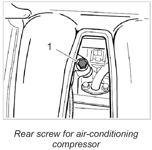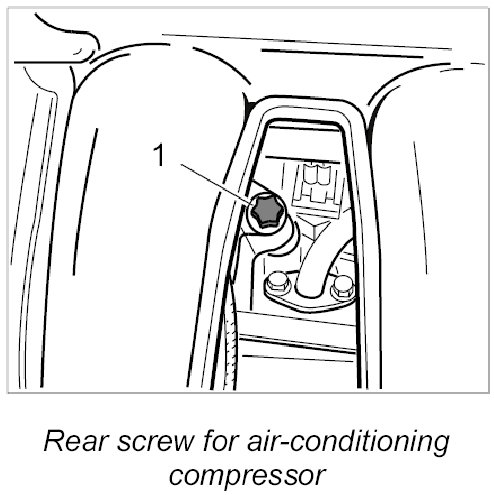 3. Unscrew rear Torx screw for air-conditioning compressor (M8 x 120) -1- between the pipes of the intake system.