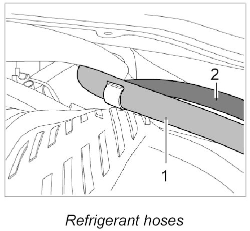 6. Clip in refrigerant hoses -1- and -2- between body and intake-air distributor.
