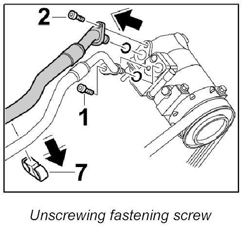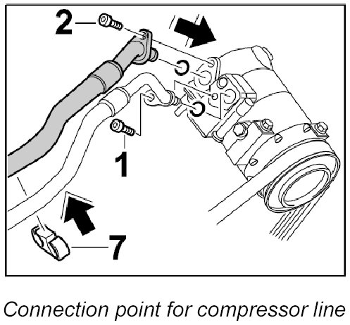 3. Unscrew the refrigerant line between the compressor and condenser at the connection points on the compressor and on the condenser and disconnect it.