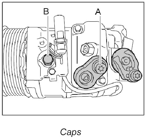 1. First, open the cap on the high-pressure side and relieve the pressure from the compressor -A-.