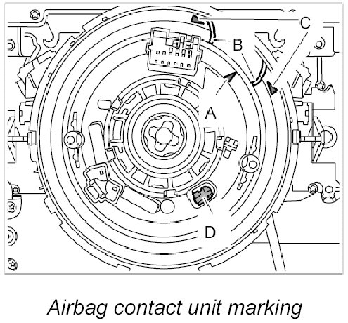 INFORMATION: Ensure that arrow -A- on the rotor is positioned between the markings -B- of the arrows -C- on the airbag contact unit and that the locking element -D- is engaged.