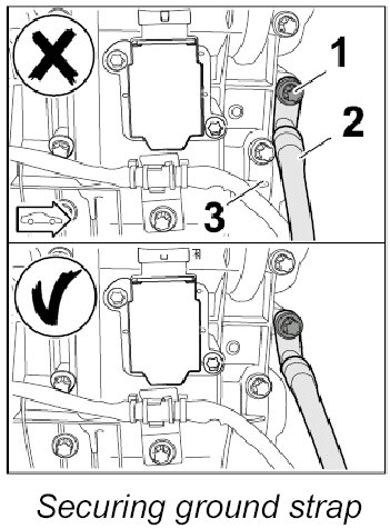 1. Loosen fastening screw -1- slightly. Fit ground strap -2- in the bracket so that there is no contact with the valve cover -3-.