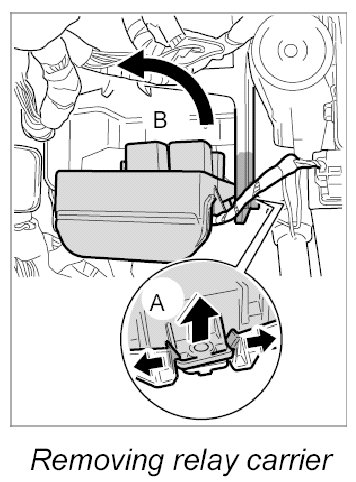 1. -A- Pull apart both retaining lugs on relay carrier support and press the relay carrier upward.