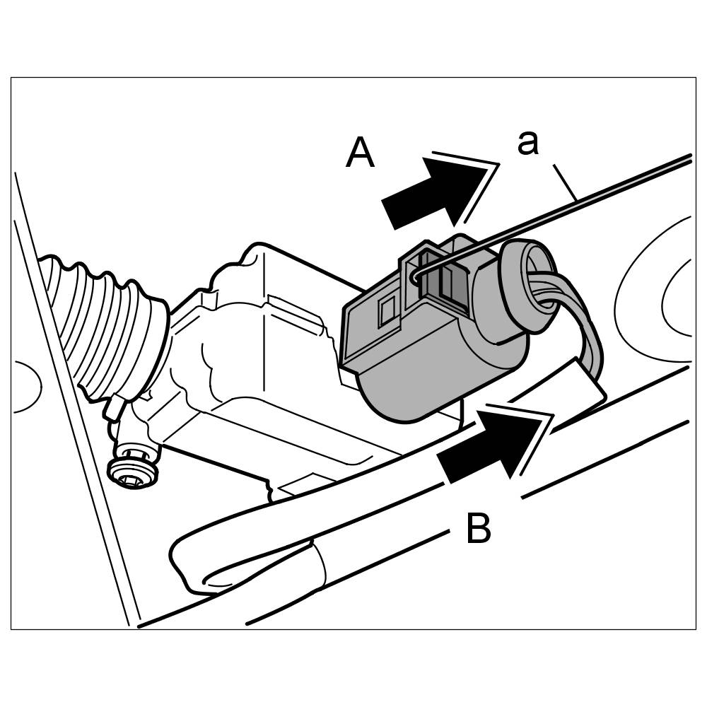 1.1. Release connector on motor for lid-release with suitable auxiliary materials (e.g. angled piece of wire with diameter of approx. 1mm) -a- -arrow A- and pull off -arrow B-.