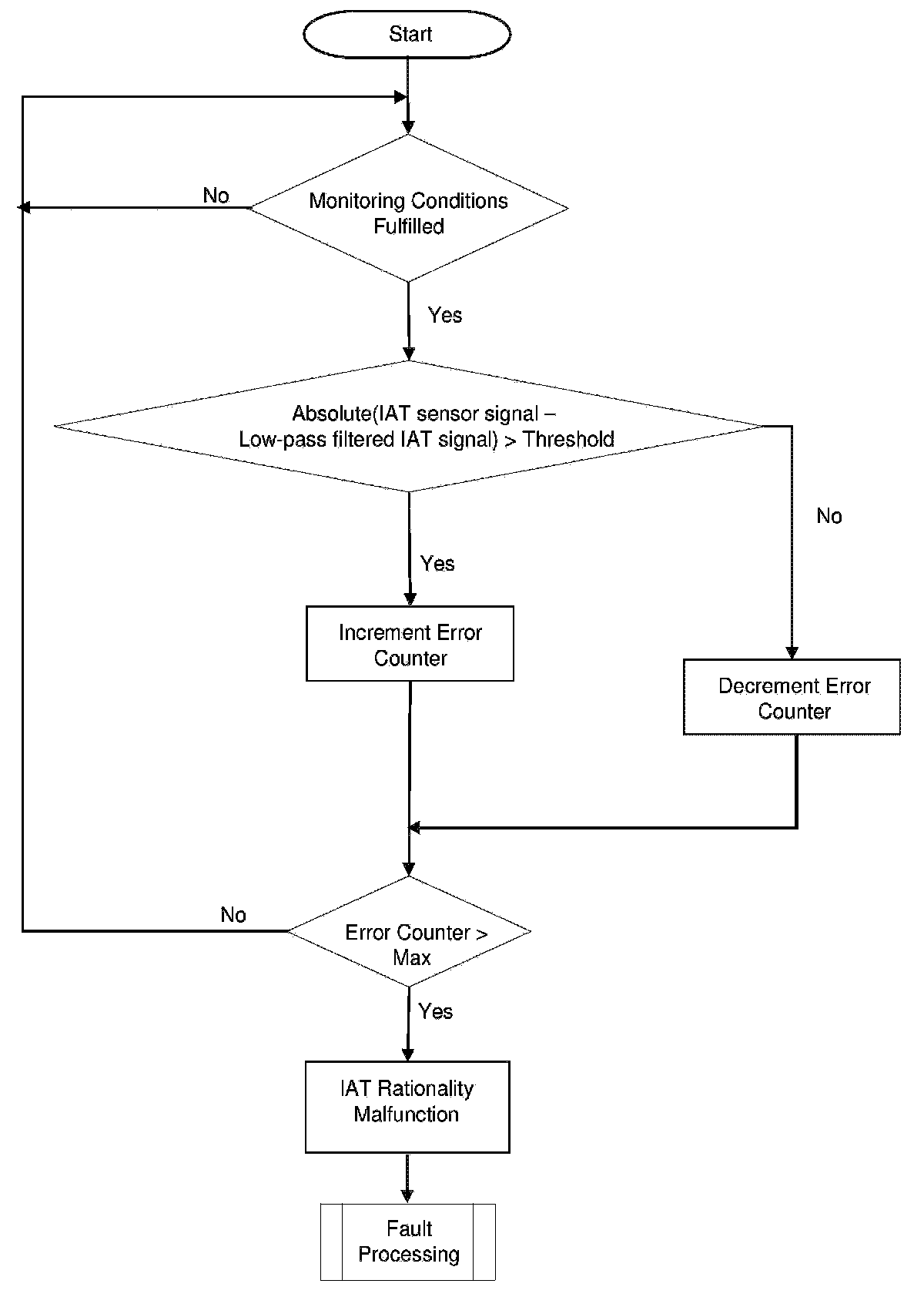 This diagnosis checks IAT for a Stuck signal. If the vehicle was driven for a mini-mum required distance and time-after-start, then the change in the IAT signal during this period should be above a calibrate able threshold. If this is not the case, a stuck IAT signal is detected.