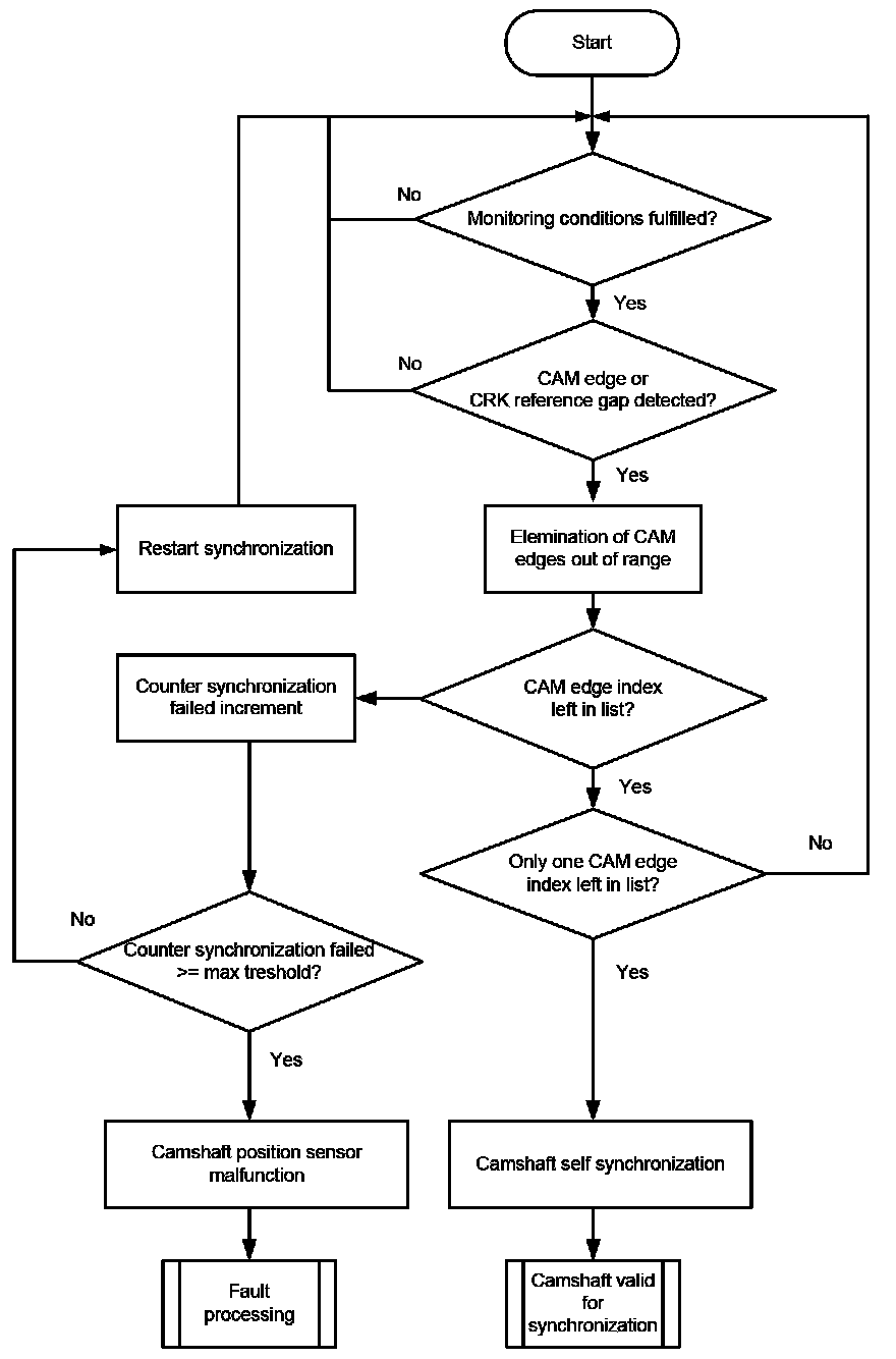 The monitor eliminates with every event the edges from the list of all 8 cam edges, which are not insides the pattern. If only one edge is left, the edge number is identified and the camshaft is valid for synchronization. If no edge is left in the list, synchronization failed and is started again. If a calibrated number of synchronizations failed, the error is delivered to the error management. Afterwards, and only if synchronization fails with the intake camshaft.