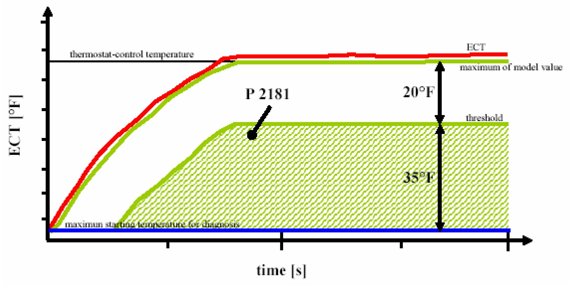 If the engine coolant temperature does not reach a certain value under normal driving conditions, the coolant system is defective (see graph).