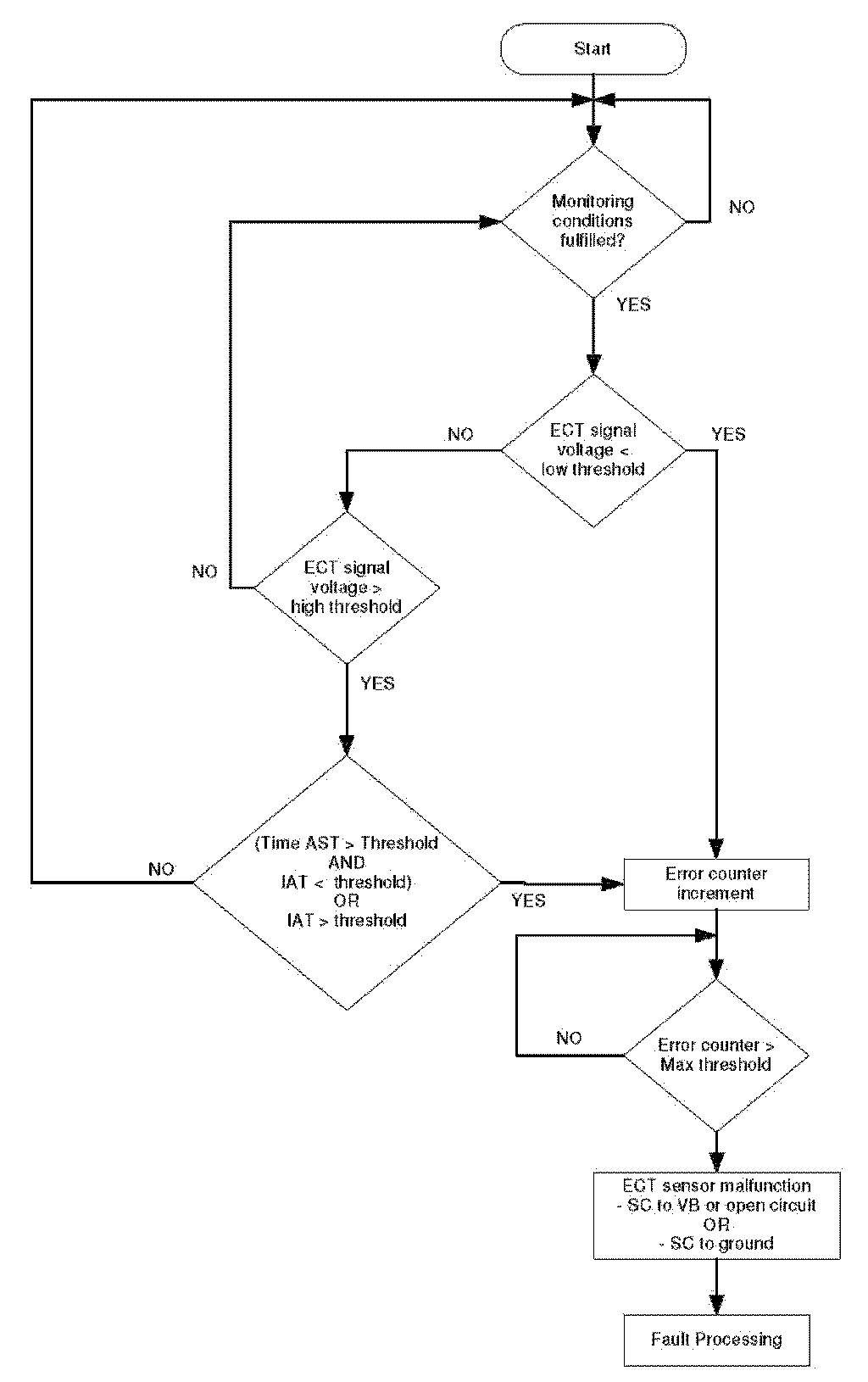 The purpose of this diagnosis is to detect electrical faults of the sensor signal. The input signal is analog from a NTC and has to be in a calibratable range. Short cut to ground can be detected immediately, short cut to voltage battery or open load after a delay time. If an error symptom is detected, the error counter is de-bounced.