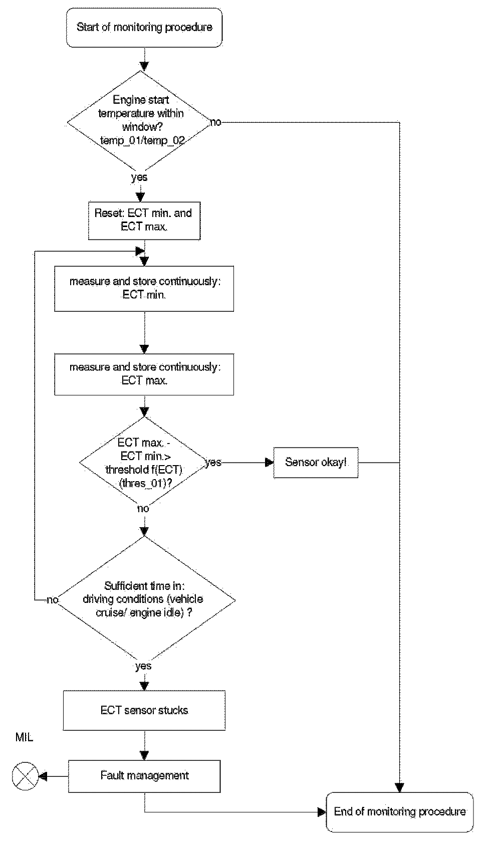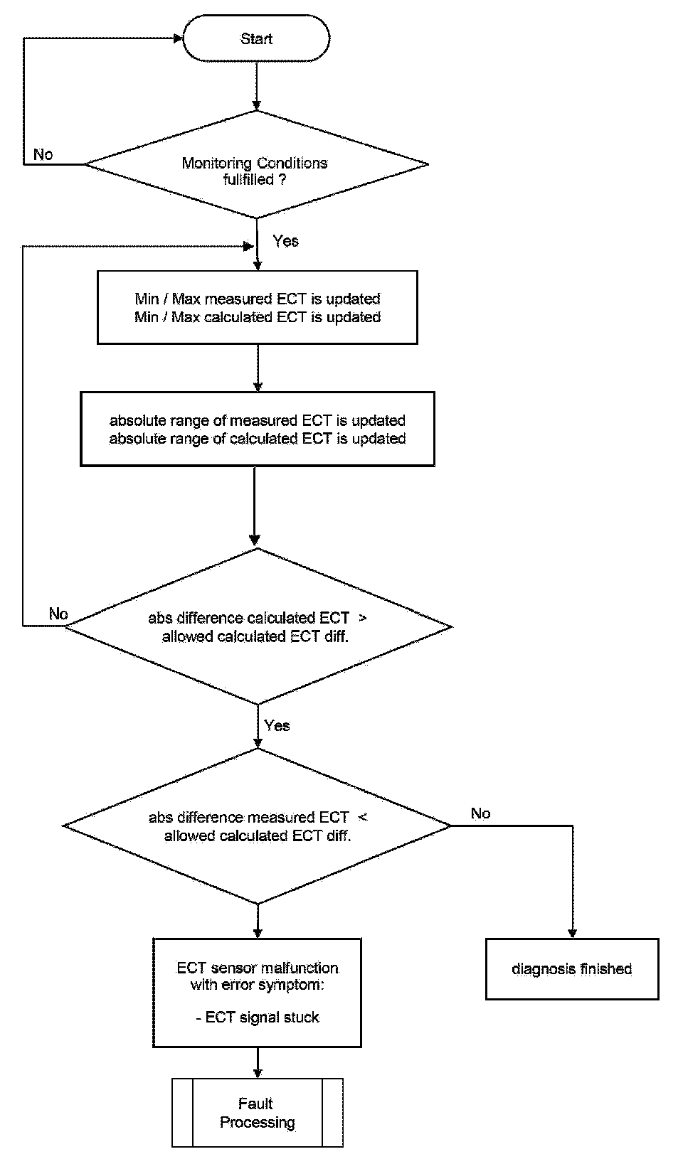 After engine start the system stores continuously the lowest and highest ECT. In case that after several driving conditions the difference between ECT max and ECT min is lower than the threshold the sensor stuck at high values.