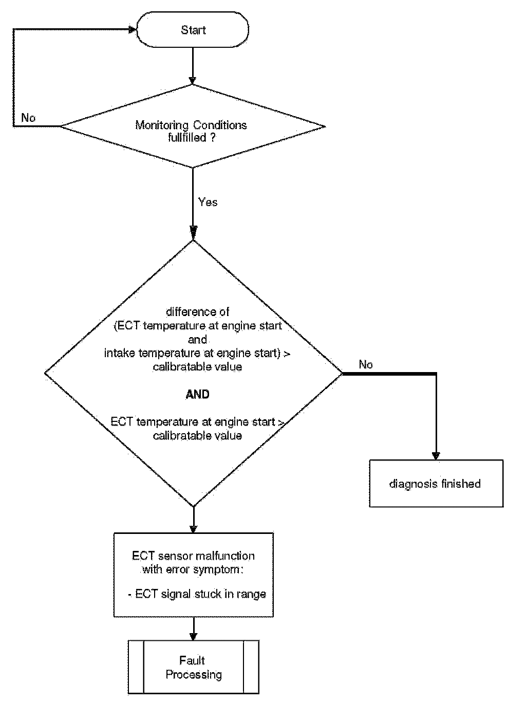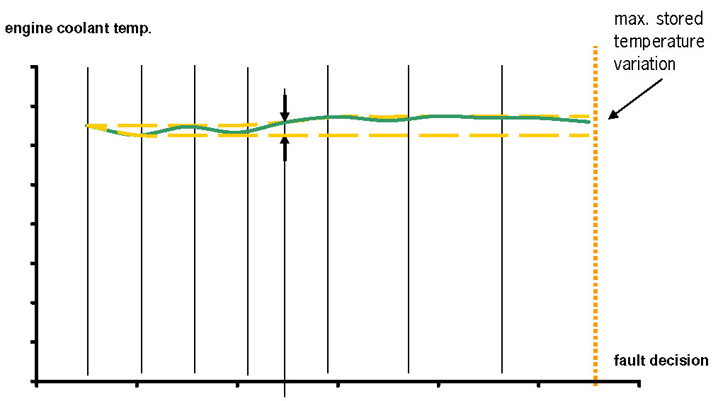 This coolant temperature plausibility diagnosis is performed once per engine run. At low ambient temperature a stuck open thermostat can cause an insufficient engine warm up. In the case that the coolant temperature is lower than the start temperature for coolant thermostat diagnosis a coolant temperature plausibility error will be detected.