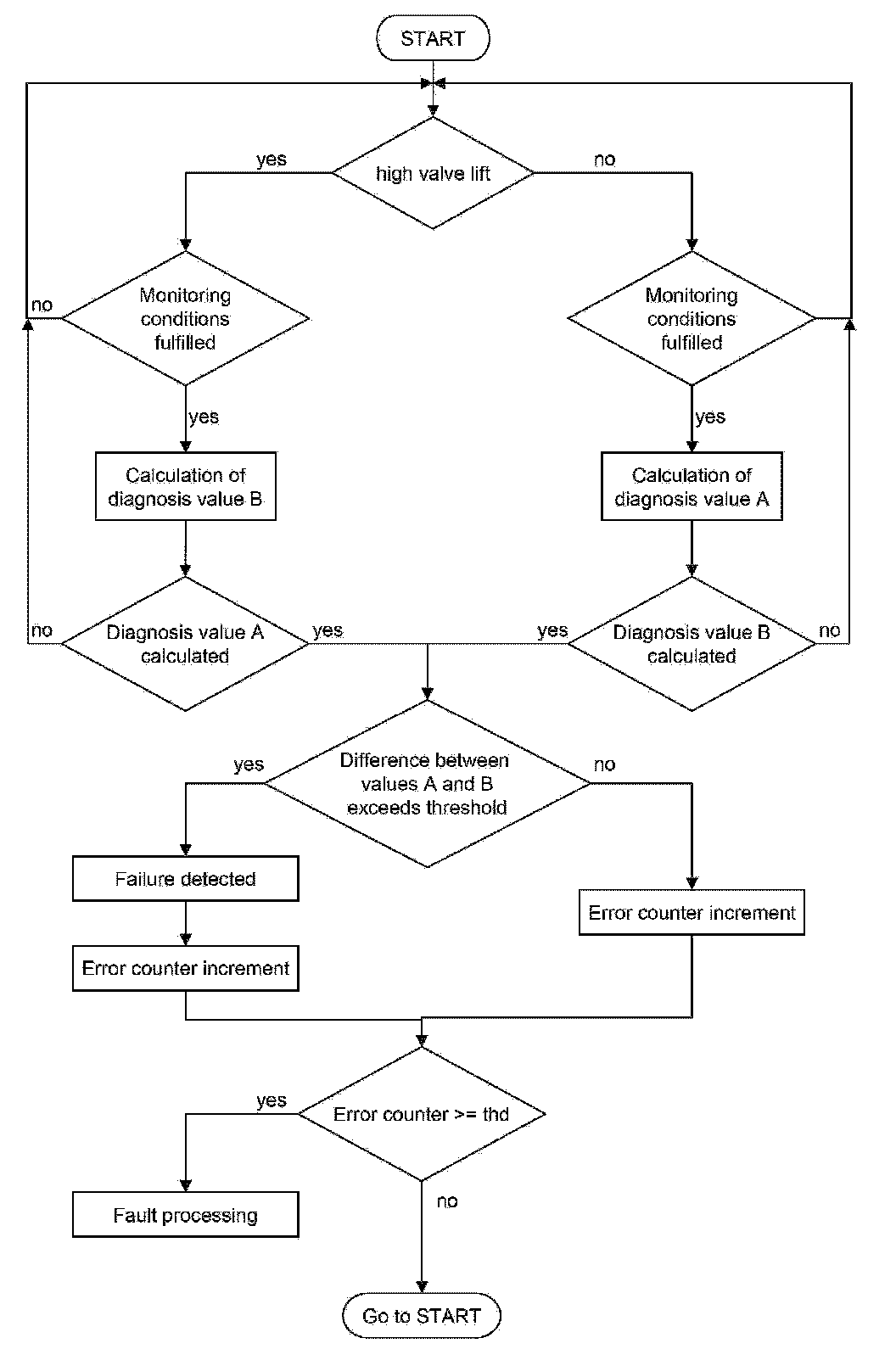 If the difference between the diagnosis values A and B exceeds a certain threshold a failure is detected.