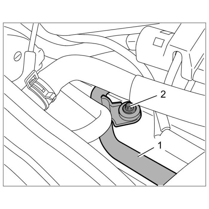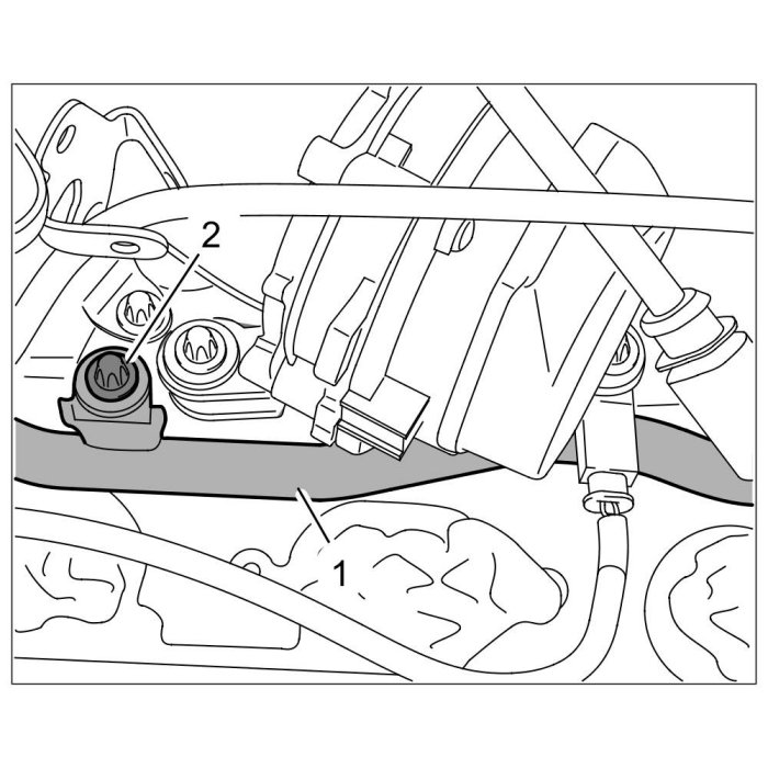 1. Unscrew external Torx screw (E10, M6 x 20) -2- on the secondary-air line -1- at the cylinder head.