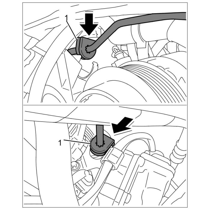 3.1. Using the rubber sleeves -1- , carefully press the fuel line into the two brackets -arrows-.