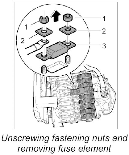 2. Unscrew the fastening nuts on the faulty fuse element -1- , remove the washer -2- and take out the fuse element -3-.