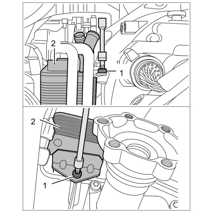 1.1.3. Fit ATF line -2- on the ATF cooler and screw in and tighten M6 x 12 screw -1-.