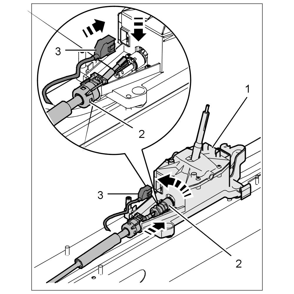 Fit parking lock cable -2- and B+ cable -3- into the holder -1- and lock into place.