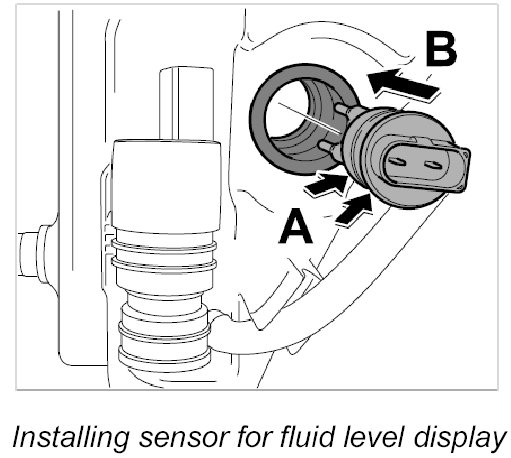 2. Apply a suitable rubber lubricant (tyre mounting paste) to the sealing surface -arrows A- and press the sensor for fluid level display into the rubber seal -arrow B- until the sensor is felt to engage.