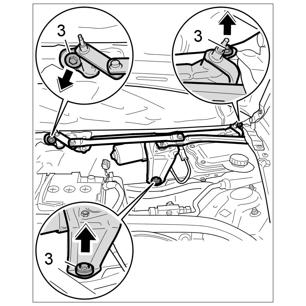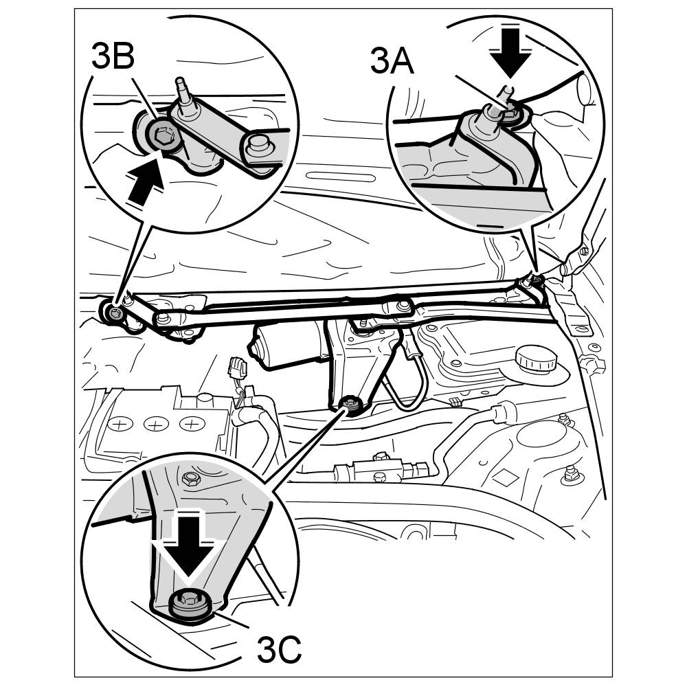 2. Position wiper linkage in the radiator tank and screw down the fastening screws -3A, 3B, 3,C- in turn. => Tightening torque: 10 Nm (7.5 ftlb.)