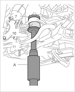 4. Loosen the suspension subframe bearing on both sides, carefully lower the gear support (loosen the spindle carefully at the same time) until you get the clearance needed for using the press-out tool.