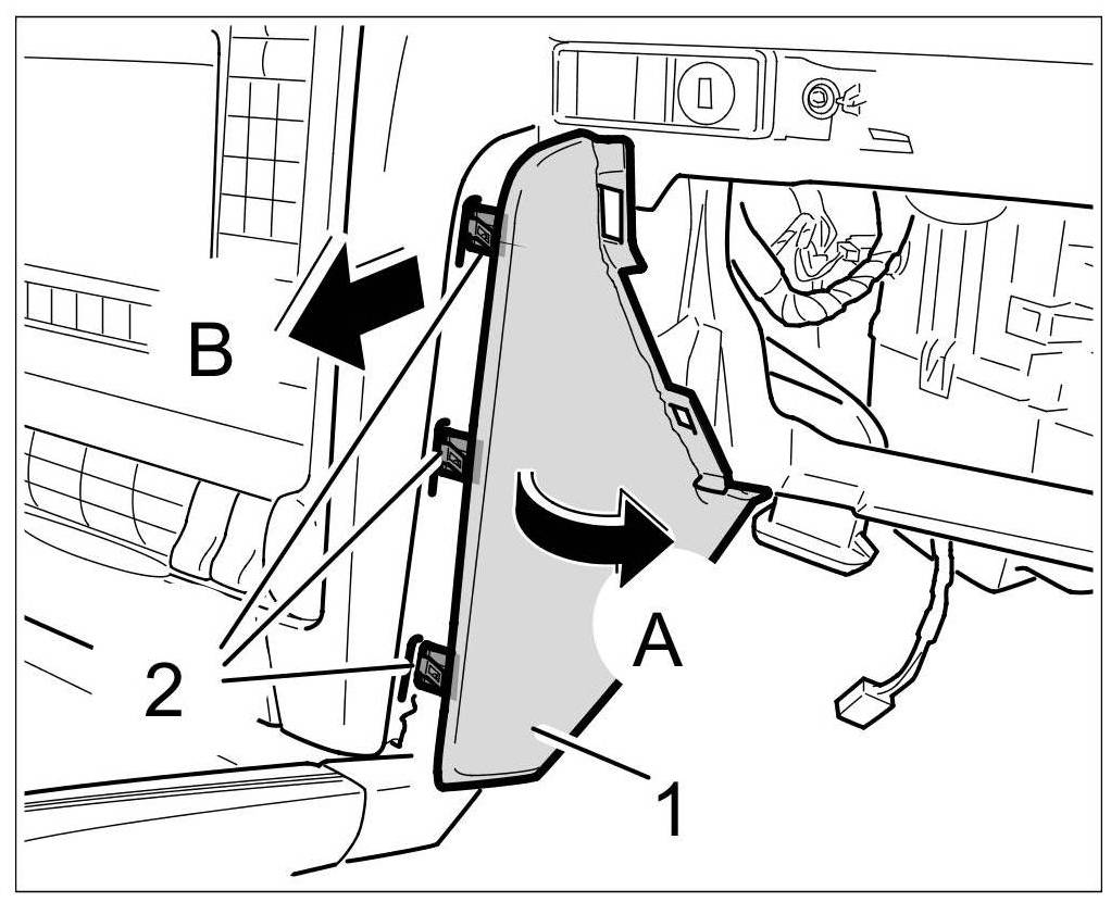 1. Unclip cover for bracket -1- using a plastic wedge at the retaining clips -2- and swivel it out -arrow A-.
