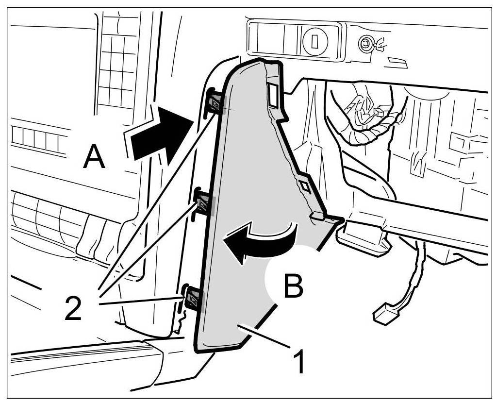 2. Swivel cover for bracket -1- inward -arrow B- and press it in until the retaining clips -2- click into place.