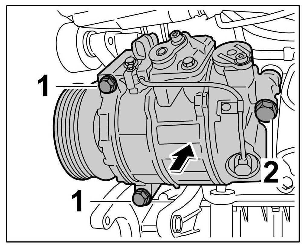 4. Unscrew fastening screws -1 and 2- and take out the air-conditioning compressor by moving it to the side and upwards -arrow-.