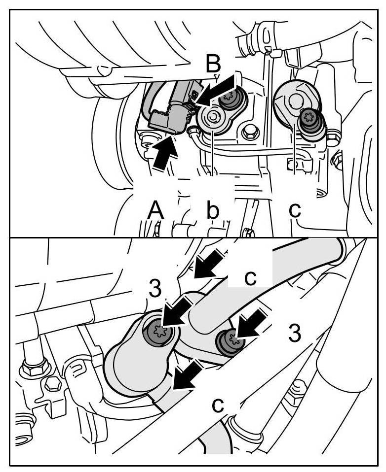 10. Connect the two refrigerant lines -arrows C- and secure them with the fastening screws -arrows 3-. => Tightening torque: 20 Nm (15 ftlb.)