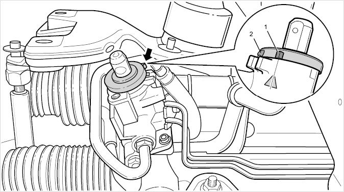 6. Afterwards, adjust front wheel alignment if necessary until marking on steering housing (triangle) is aligned with the marking lug -1- of the driver.