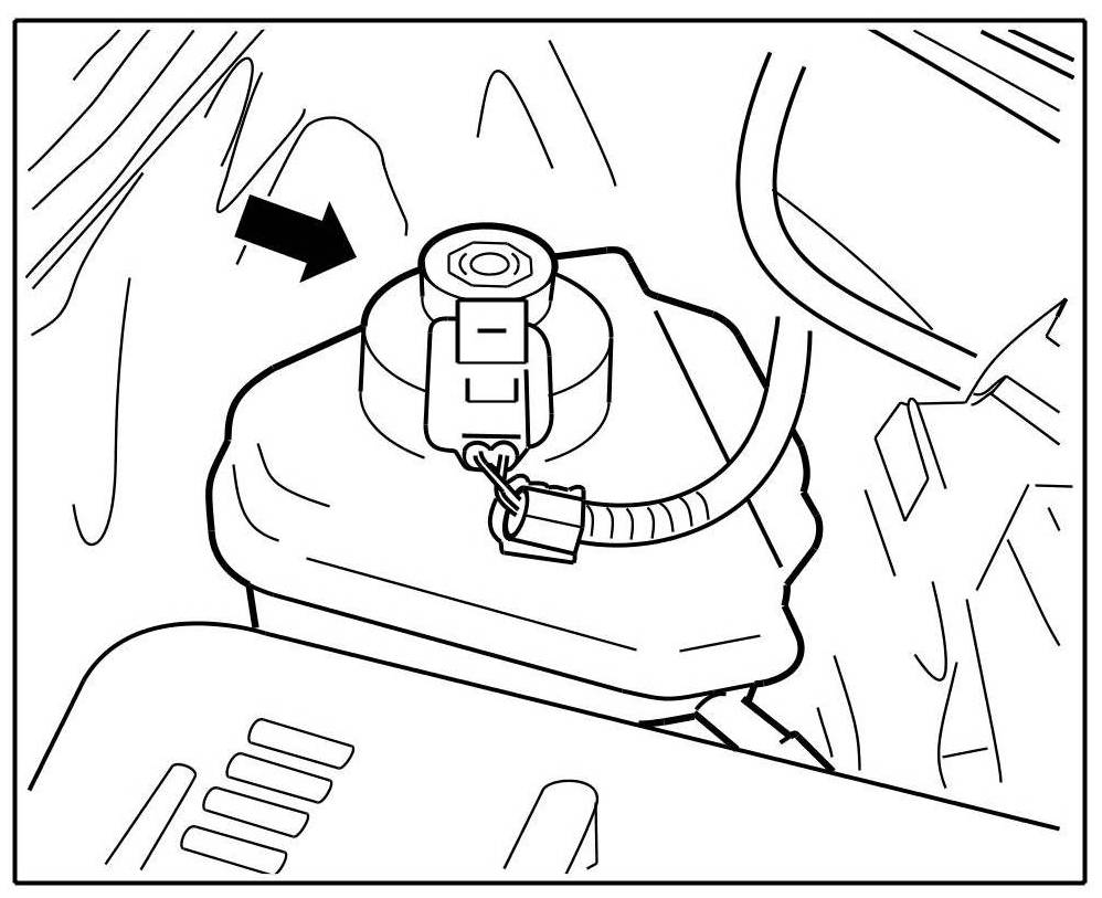 Visually inspect brake fluid level. The brake fluid level must be between the MAX and MIN markings. The brake fluid reservoir is located under the left plenum panel cover -arrow-.