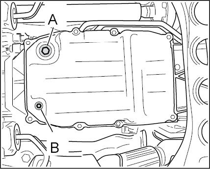 4. Screw in oil drain plug -B- with new sealing ring. - Tightening torque: 28 Nm (21 ftlb.)
