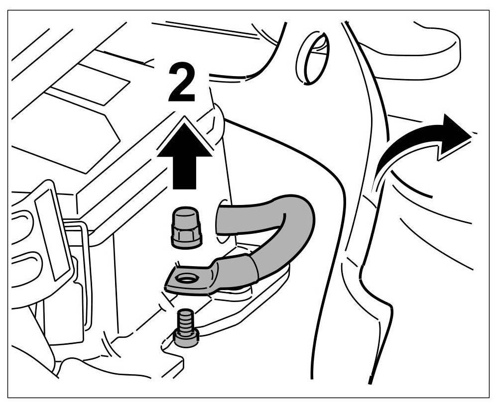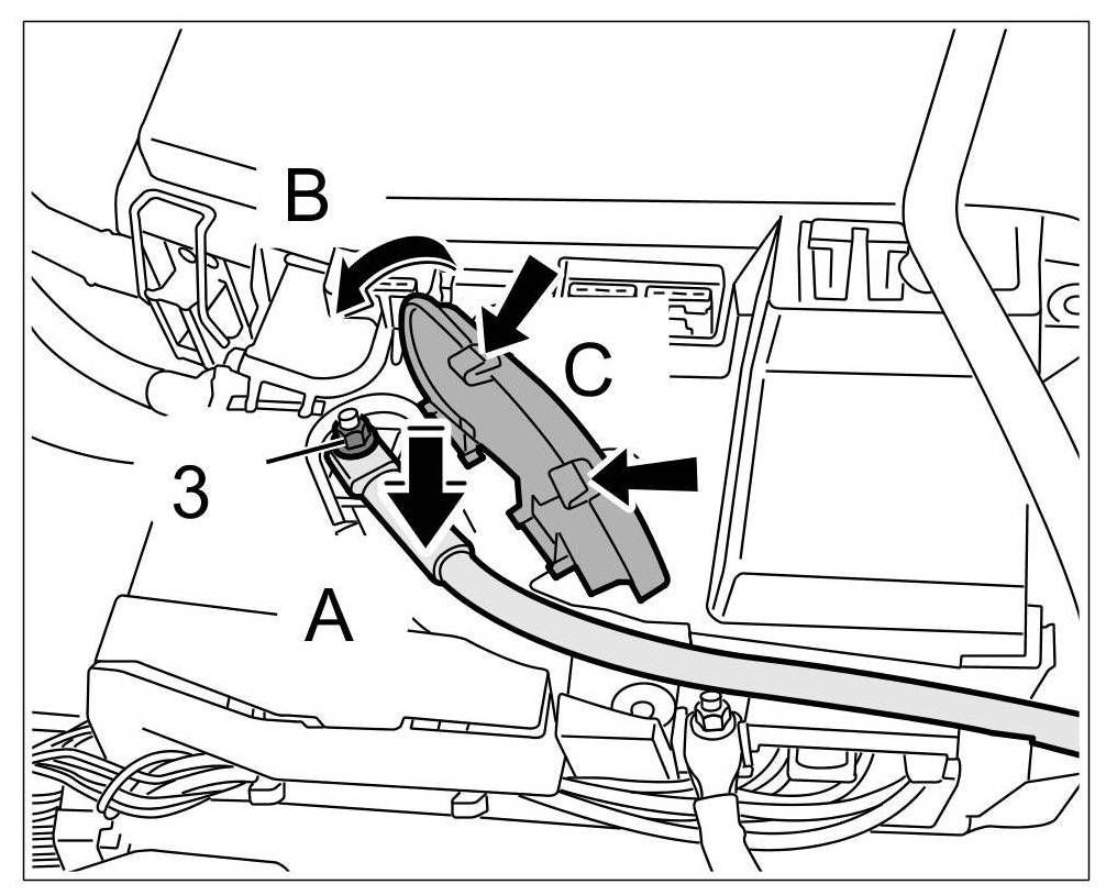 8. Unscrew fastening nut -3- and remove line for auxiliary battery -Arrow C-.