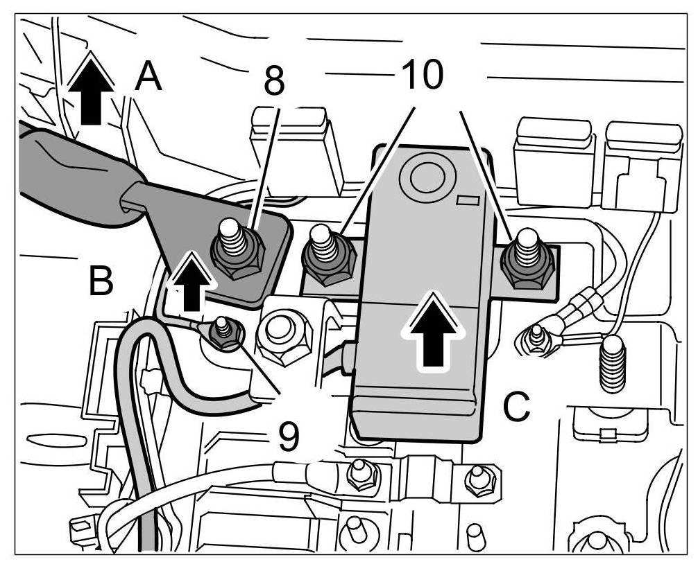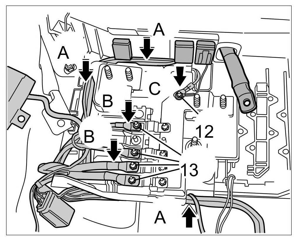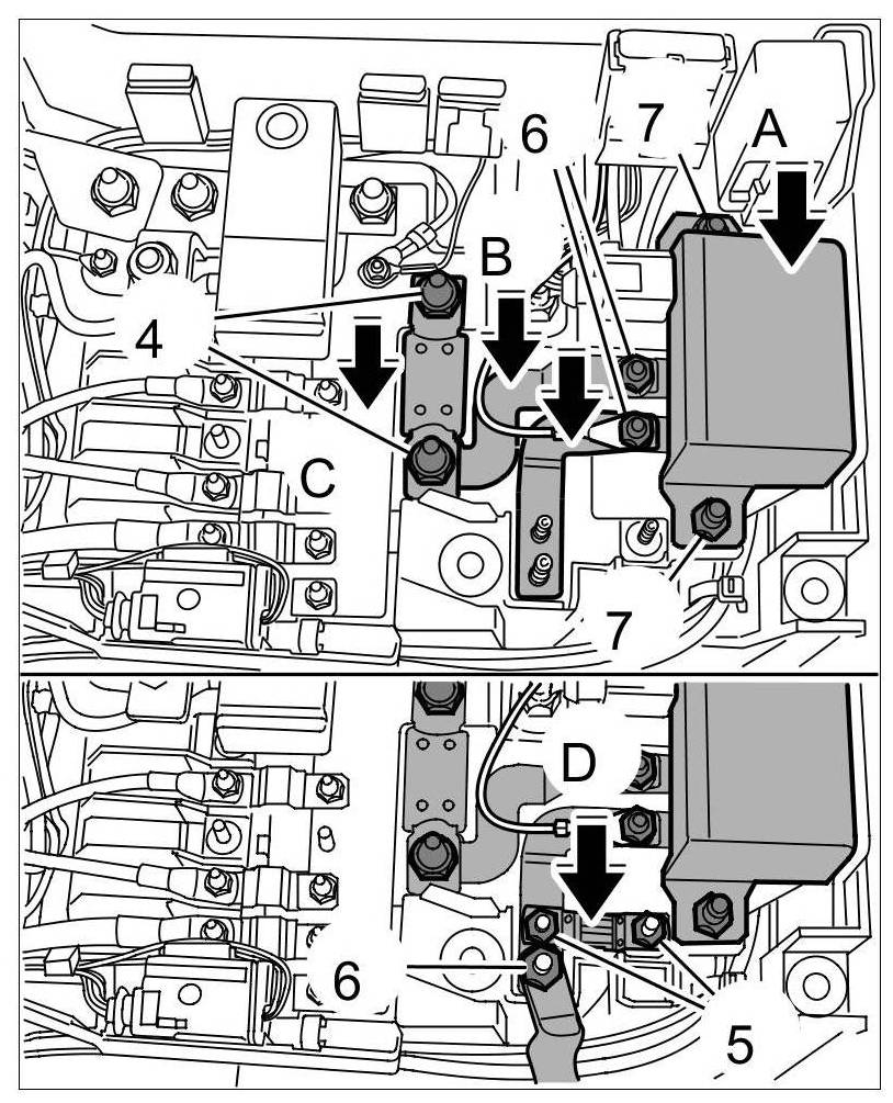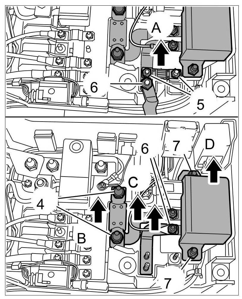 12. Undo fastening nuts -6- then remove line and contact bridges -Arrows C-.