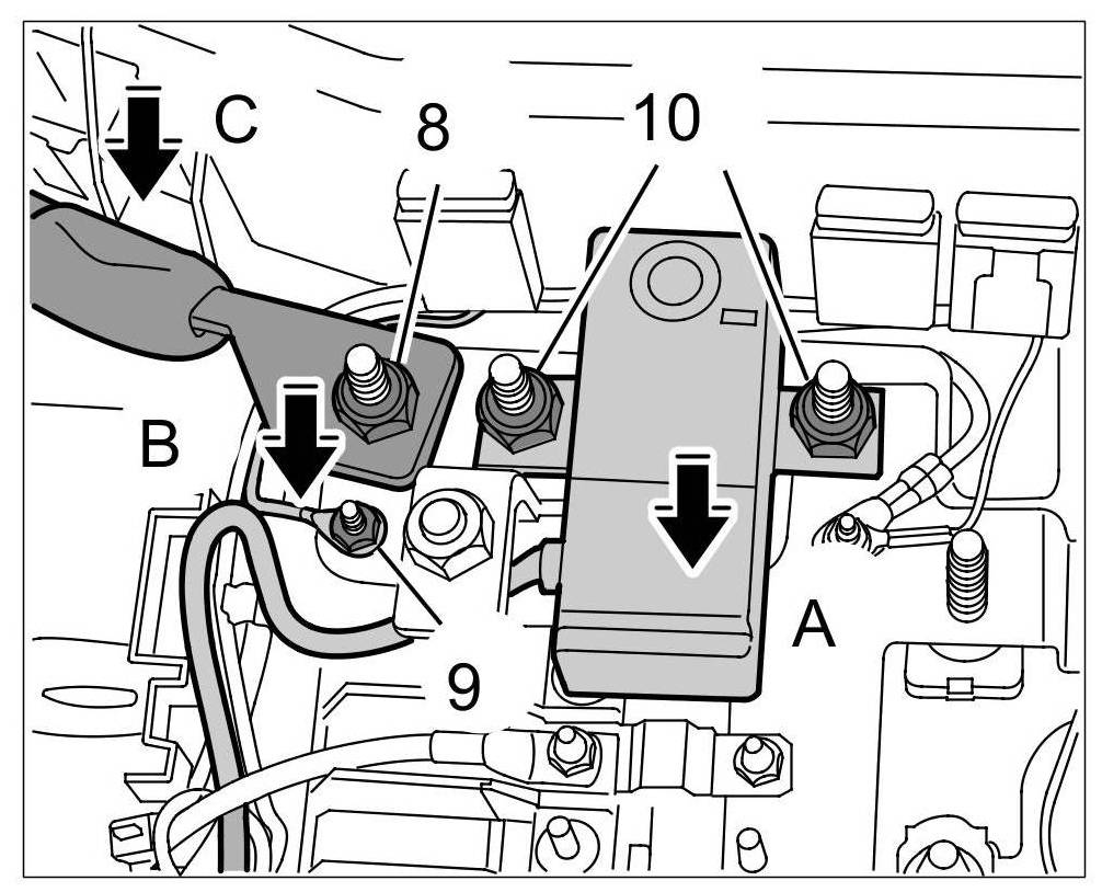 9. Place line on threaded bolt -Arrow C- and tighten with the fastening nut. -8- => Tightening torque: 12 ftlb..