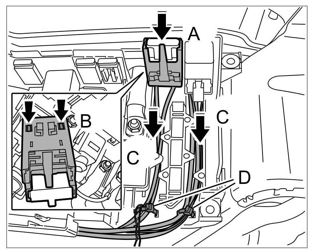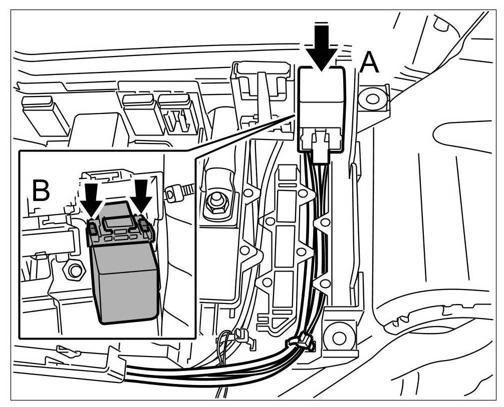 15. Place relay carrier in installation position and press in -Arrow A- until locking tabs -B- are felt to engage.