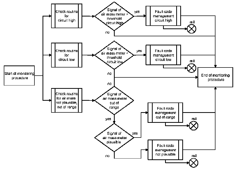 The output voltage of the air mass meter is a measure of air mass. The diagnostic routine compares the mass flow measured by the air mass meter with a calculated mass flow, derived from engine speed an throttle position.