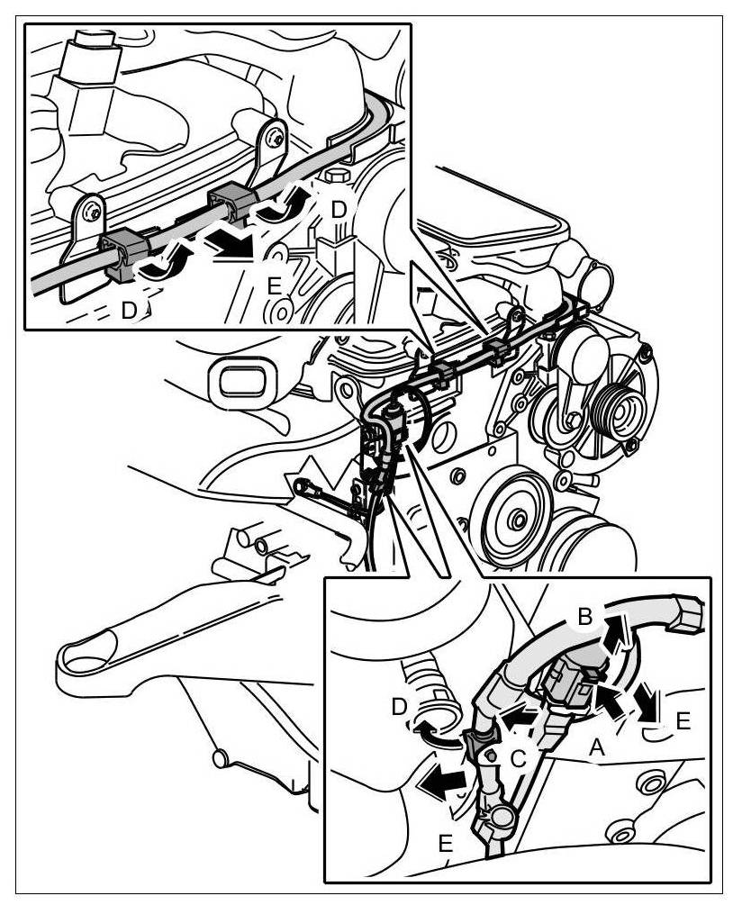 2. Remove connector on the right knock sensor (under the exhaust manifold) at the front of the cylinder head cover and release the socket -A, B and E in bottom part of illustration-.