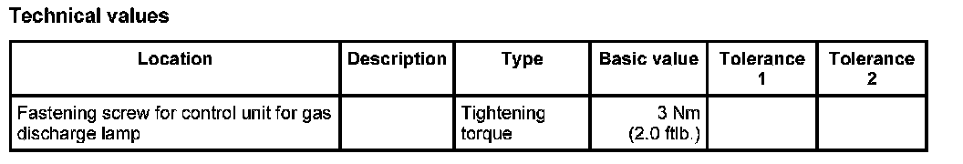 1. Position control unit for gas-discharge headlight -2- on the Bi-Xenon headlight -3- in -direction of arrow- and secure it with the three fastening screws -2-. - Tightening torque: 3 Nm (2.0 ft-lb.)
