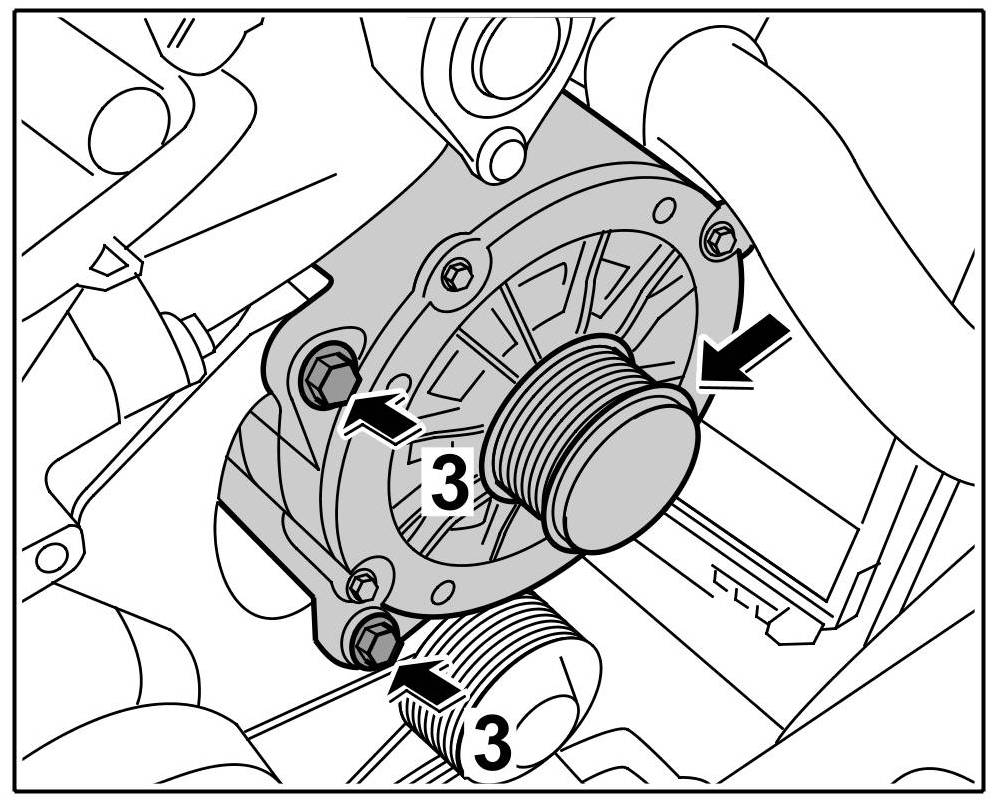 3. Place the generator in installation position -arrow- and secure with the fastening screws -arrows 3-. => Tightening torque: 20 Nm (15 ftlb.)
