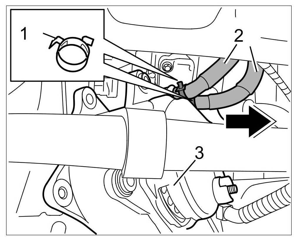 1.1. Slide new spring band clamp -1- onto the supply and return hose -2-.