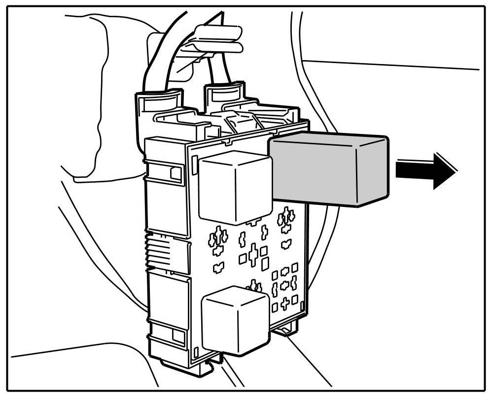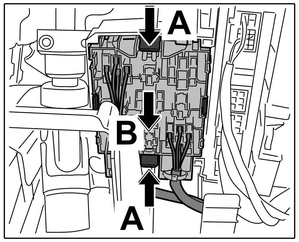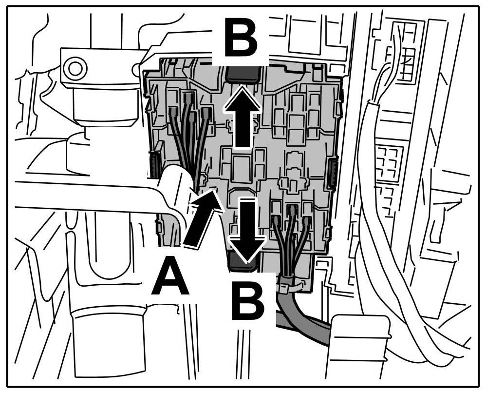 1. Release the left relay carrier -Arrows A- and pull it down and out -Arrow B-.