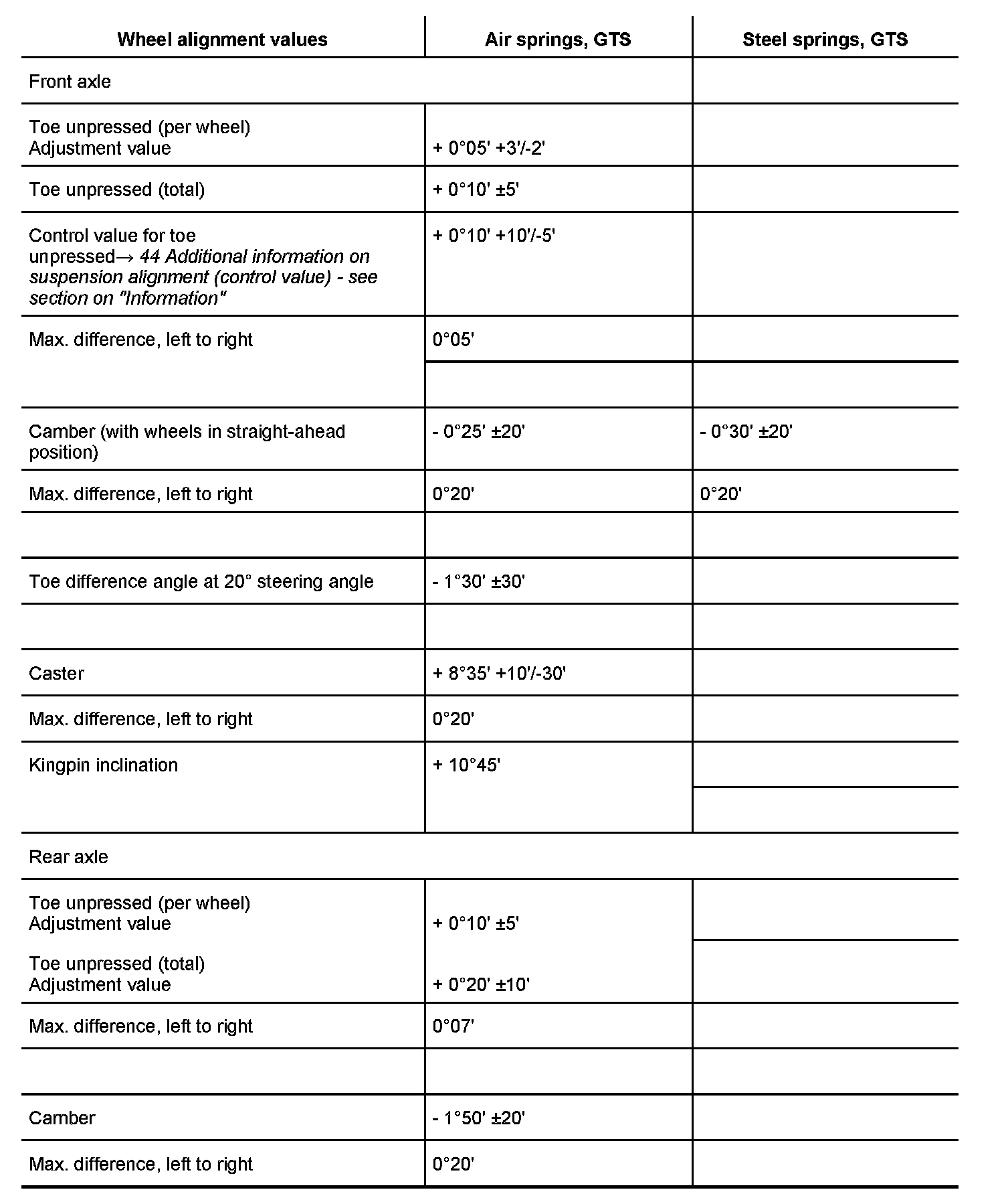 The "Steel springs, GTS" column shows only the alignment values that are different from the values in the "Air springs, GTS" column. The values that are not shown are identical to those in the "Air springs, GTS" column.