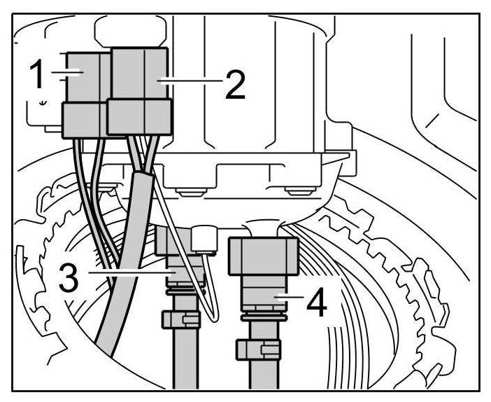 1. Disconnect electric connectors -1 and 2-. Then pull off the fuel lines -3 and 4- and remove the connecting flange.