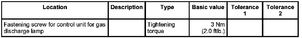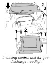 1. Position control unit for gas-discharge headlight -2- on the Bi-Xenon headlight -3- in -direction of arrow- and secure it with the three fastening screws -2-. - Tightening torque: 3 Nm (2.0 ftlb.)