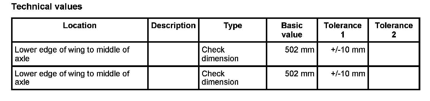 - The entire threaded parts of the axle must be tightened in vehicle position. Vehicle position means: vehicle standing on the wheels, or the wheel suspension is raised using a universal vehicle lift. -Dimension X-, corresponds to vehicle position. - Check dimension: 502 mm ± 10 mm