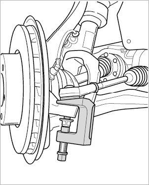 - Do not raise the wheel suspension higher than the normal vehicle position (vehicle resting on wheels). When raising the suspension, use a suitable -intermediate layer (hard rubber)-. Do not damage the brake cover plate.