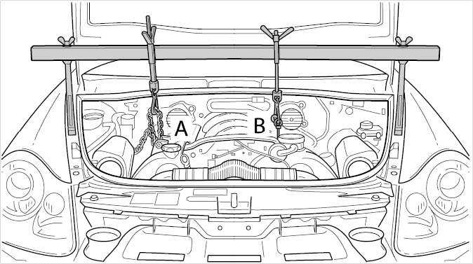 11. Remove the safety device 10-222 A. To do this, remove the transport eyebolt 97000 -B- and the chain -A-, which is used to secure the engine.