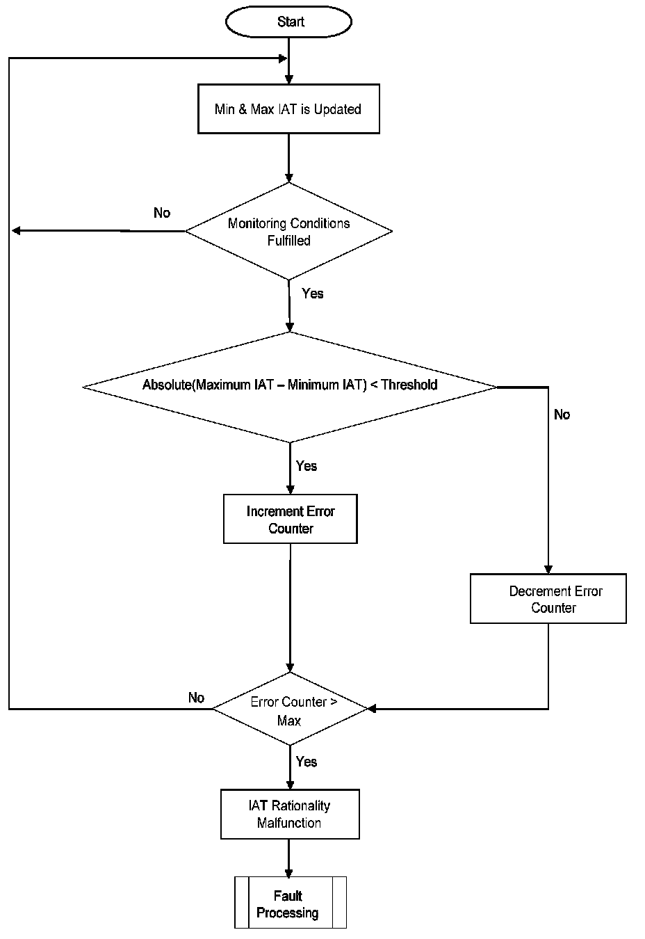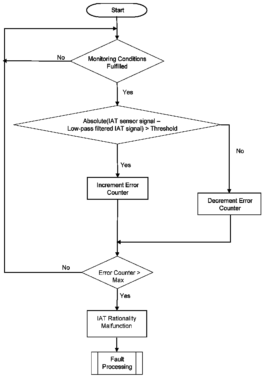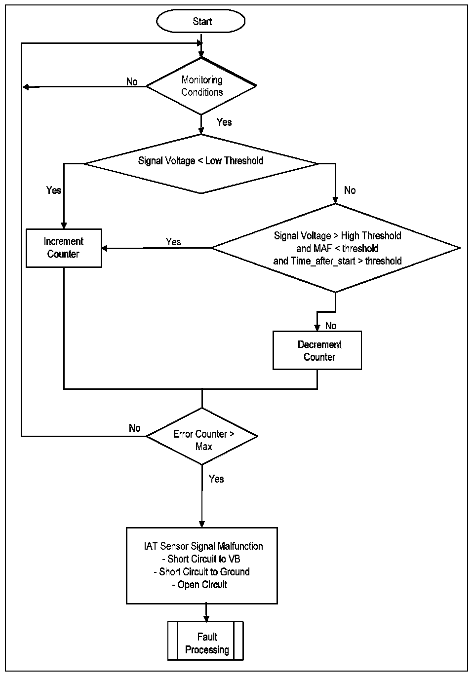 This diagnosis checks IAT for a Stuck signal. If the vehicle was driven for a mini-mum required distance and time-after-start, then the change in the IAT signal during this period should be above a calibrate able threshold. If this is not the case, a stuck IAT signal is detected.