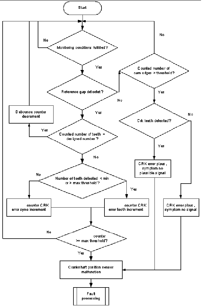 A teeth counter is incremented at every falling edge of the CRK sensor signal. If plus or minus one tooth is detected Flowchart diagnosis of mechanical reference position and diagnosis of chain jump. 360 °CA at the reference gap, the tooth number counter will be incremented. If the counter exceeds a limit, a CRK tooth error is delivered to the error management. If more then one tooth plus or minus is detected the CRK looses synchronization and a CRK sync counter will be incremented. If the counter exceeds a limit, a CRK sync error is delivered to the error management.